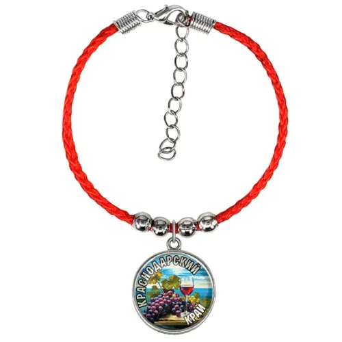 Браслет из красного шнура с металлической основой и выпуклым стеклом.