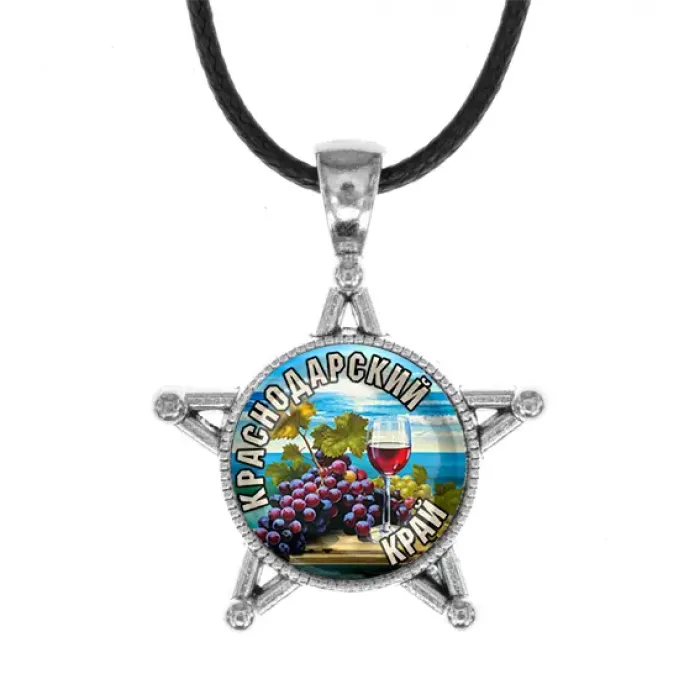 Кулон в виде звезды из бижутерного сплава под серебро со стеклянной линзой.