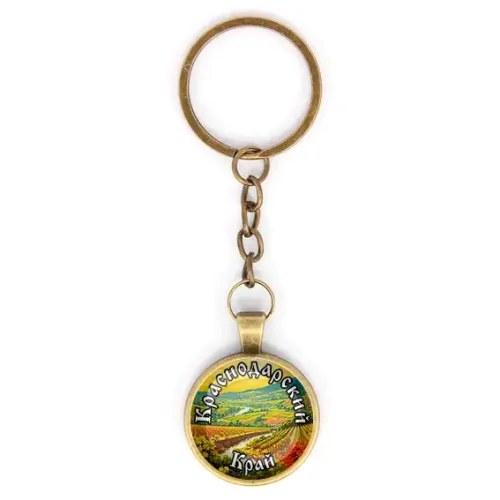 Брелок сувенирный круглой формы с изображением Краснодарского края, выполнен из бижутерного сплава со стеклянной линзой.