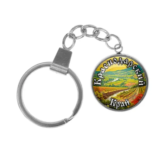 Брелок из нержавеющей стали с изображением Краснодарского края под стеклянной линзой.