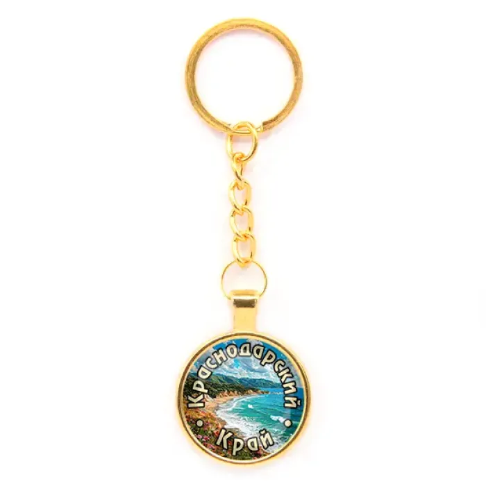 Круглый брелок-сувенир из бижутерного сплава с золотым покрытием и стеклянной линзой, посвященный Краснодарскому краю.