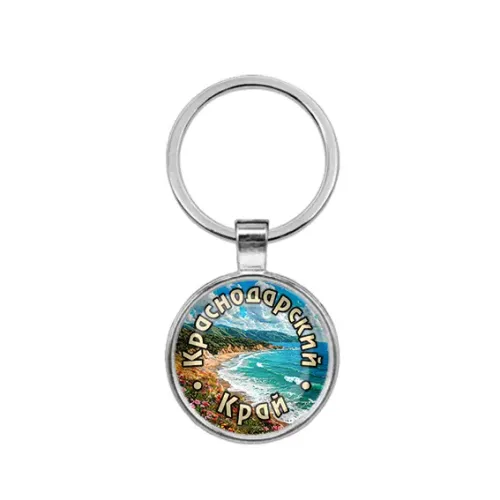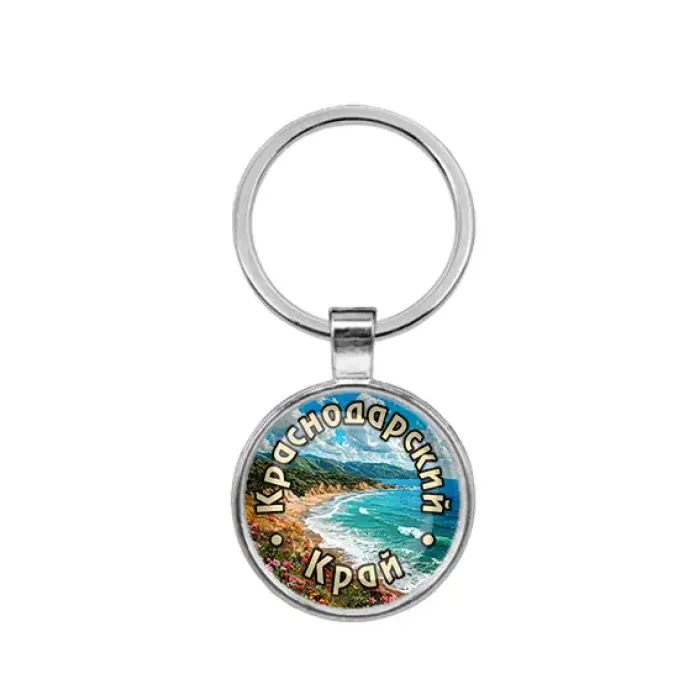 Круглый брелок-сувенир с изображением Краснодарского края. Изготовлен из бижутерного сплава со стеклянной линзой и покрытием под серебро.