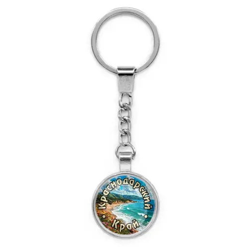 Круглый брелок-сувенир из бижутерного сплава с серебристым покрытием и стеклянной линзой, посвящённый Краснодарскому краю.