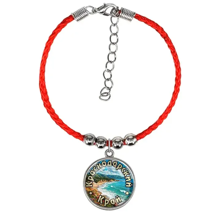 Браслет из красного шнура с металлической основой и выпуклым стеклом, сувенирный аксессуар, связанный с Краснодарским краем.