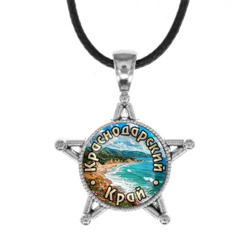 Кулон в форме звезды из бижутерного сплава под серебро со стеклянной линзой.