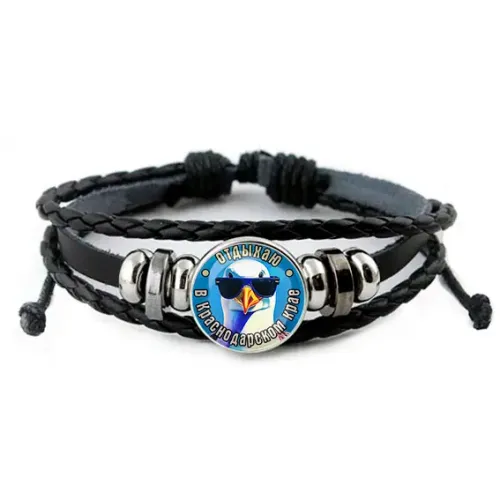 Браслет с сувенирным изображением, изготовленный из экокожи и бижутерного сплава.