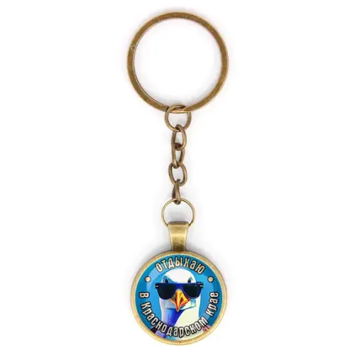 Круглый брелок с изображением и надписью «Отдыхаю в Краснодарском крае». Материал — бижутерный сплав с бронзовым покрытием и стеклянной линзой.