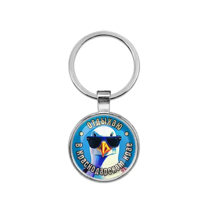 Брелок сувенирный круглой формы с изображением «Отдыхаю в Краснодарском крае». Изготовлен из бижутерного сплава со стеклянной линзой.