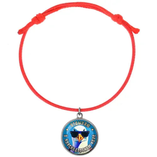 Браслет из красного шнура с подвеской. Металлическое основание с полиграфической вставкой под выпуклым стеклом.