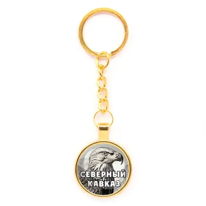 Брелок для ключей круглой формы в золотом цвете с изображением Северного Кавказа.