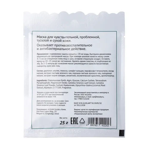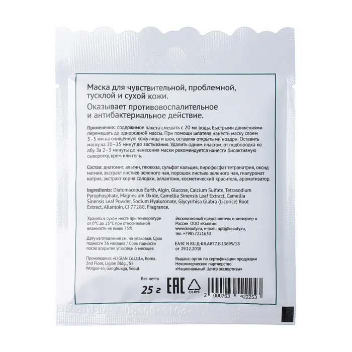 Состав: Экстракт зелёного чая, диатомовая земля, глюкоза, альгинат натрия (альгин), сульфат кальция.