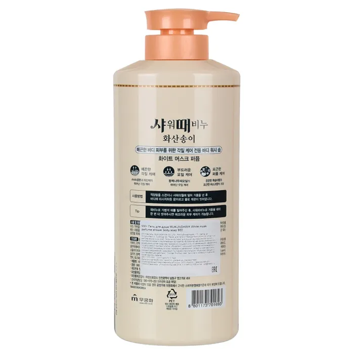 Гель-эксфолиант для душа MUKUNGHWA White musk perfume shower body soap объемом 900 мл — это средство, которое сочетает в себе очищающие и ухаживающие свойства. Продукт разработан на основе вулканической золы и комплекса масел и растительных экстрактов, что позволяет бережно удалять загрязнения с поверхности кожи. Гель способствует отшелушиванию мёртвых клеток, обновляя кожу и стимулируя её регенерацию.