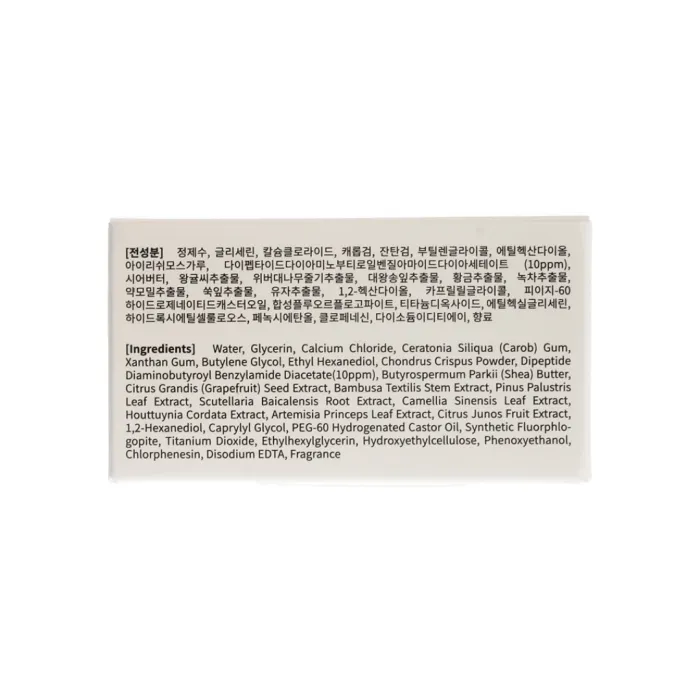Состав: Water, glycerin, calcium chloride, ceratonia siliqua (carob) gum, xanthan gum, butylene glycol, ethyl hexanediol, chondrus crispus powder, dipeptide diaminobutyroyl benzylamide diacetate (10 ppm), butyrospermum parkii (shea) butter, citrus grandis (grapefruit) seed extract, bambusa textilis steam extract, pinus palustris leaf extract, scutellaria baicalensis root extract, camellia sinensis leaf extract, houttuynia cordata extract, artemisia princeps leaf extract, citrus junos fruit extract.