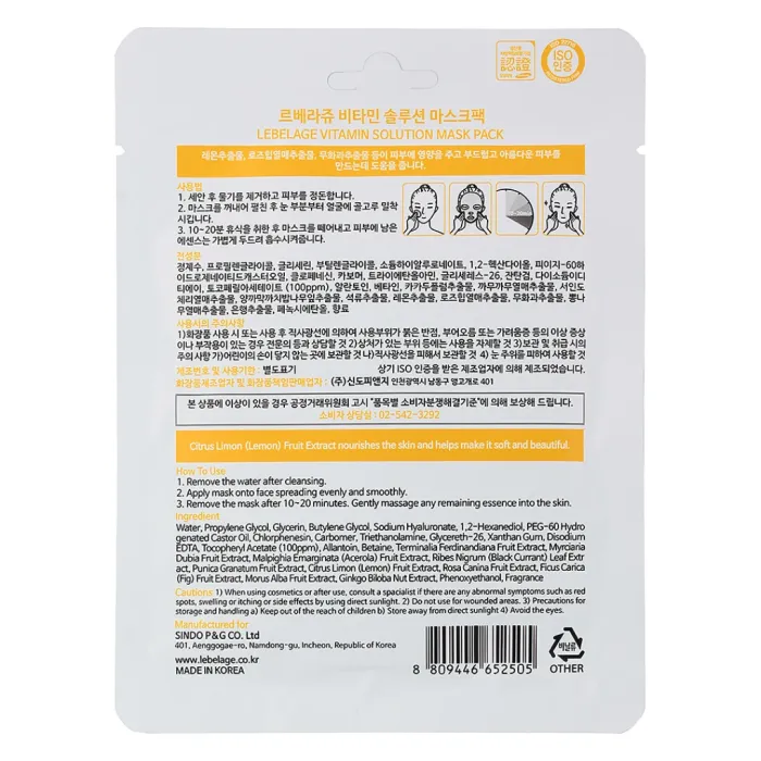 Тканевая маска Lebelage Vitamin Solution Mask предназначена для быстрого восстановления гладкости и тонуса кожи, а также для её освежения. В состав входят экстракты лимона, граната, инжира и шелковицы, которые способствуют глубокому очищению эпидермиса от ороговевших частиц. Эти компоненты оказывают антибактериальное воздействие и ускоряют заживление мелких повреждений кожи. Лимон обладает осветляющими свойствами, подавляет выработку меланина и эффективно борется с пигментными пятнами, матирует кожу и сужает поры.