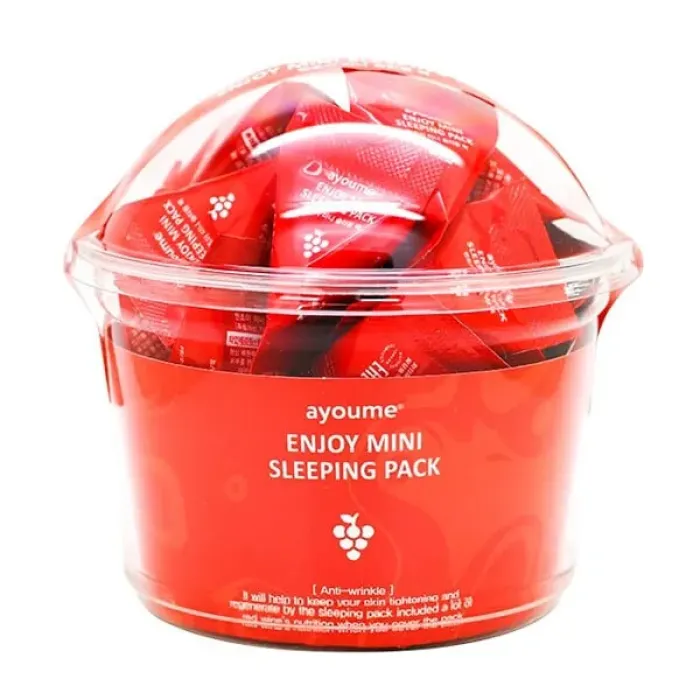 Набор ночных антивозрастных масок для лица Ayoume Enjoy Mini Sleeping Pack — это эффективное решение для ухода за кожей, направленное на борьбу с признаками старения. В комплект входит 200 мини-масок по 3 грамма каждая, что позволяет провести полноценный курс процедур в домашних условиях. Маска обогащена экстрактом красного вина, который является источником полифенолов, флавоноидов и антиоксидантов, замедляющих процессы старения кожи.