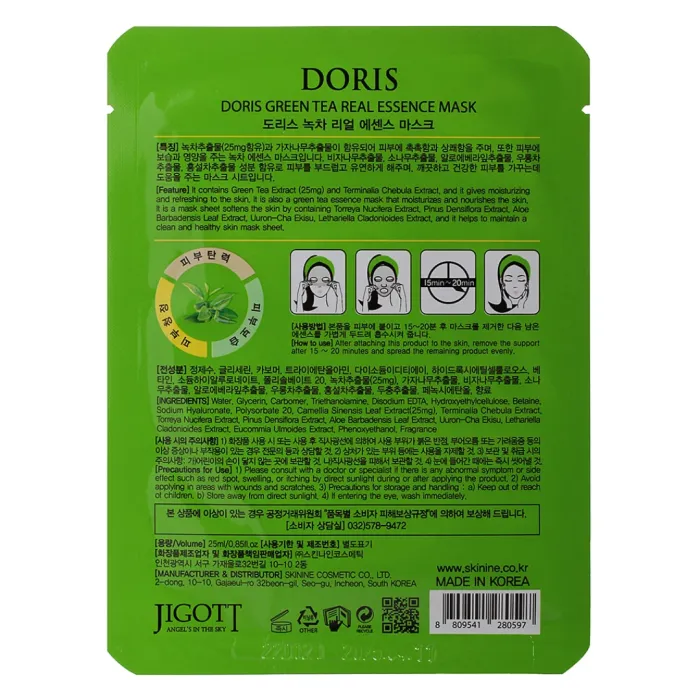 Маска на тканевой основе DORIS GREEN TEA REAL ESSENCE MASK от бренда Jigott предназначена для ухода за кожей лица. Она обогащена экстрактом зелёного чая, плодов харитаки и миксом традиционных азиатских растительных экстрактов, включая тибетский чай. Эти компоненты обеспечивают мощное антиоксидантное действие, выравнивают и осветляют общий тон кожи.