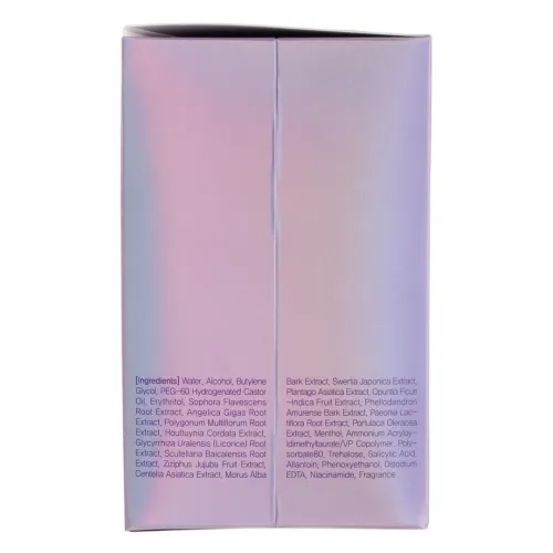 Состав: вода, спирт, бутиленгликоль, гидрогенизированное касторовое масло PEG-60, эритритол, экстракт корня софоры желтоватой, экстракт корня полигонума многоцветкового, экстракт хауттюйнии сердцевидной, экстракт корня уральской солодки, экстракт корня ангелики гигантской, экстракт плодов зизифуса, экстракт сверции японской.