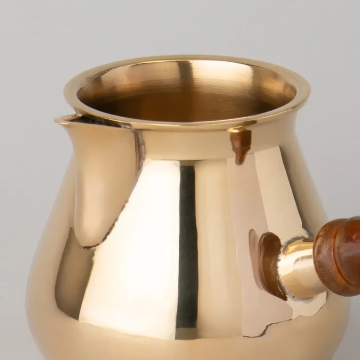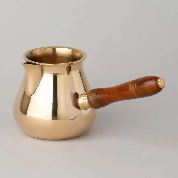 Корпус турки выполнен из латуни — материала, устойчивого к коррозии. Деревянная ручка съёмная, что облегчает хранение и уход. Узкое горлышко способствует сохранению аромата кофе во время приготовления. Декоративные элементы нанесены вручную.
