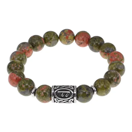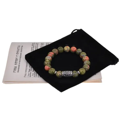 Стрейч-браслет ручной работы из натурального камня унакит и нержавеющей стали с рунической бусиной.