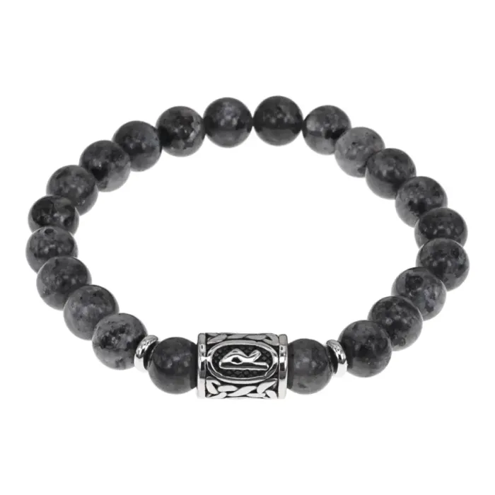 Славянский стрейч-браслет ручной работы из натурального камня и нержавеющей стали с рунической бусиной.