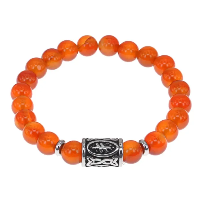 Славянский стрейч-браслет ручной работы из натурального сердолика и нержавеющей стали с рунической бусиной.