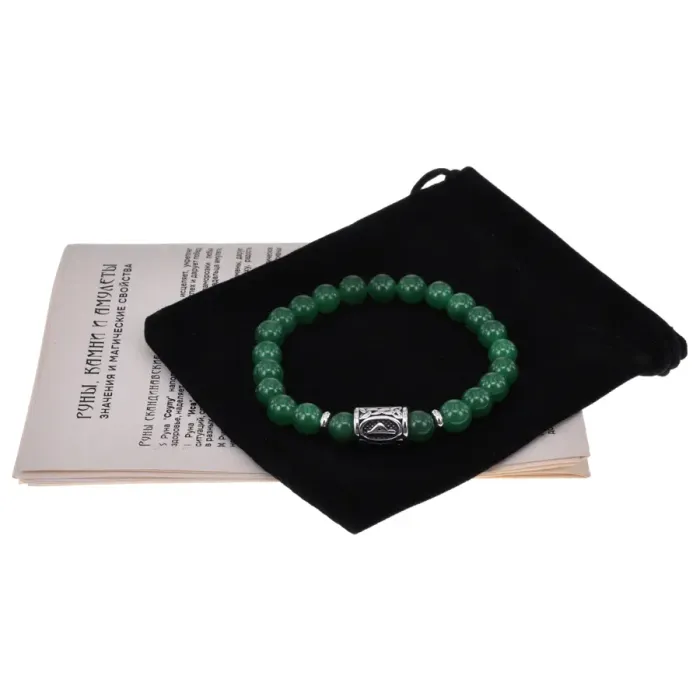 Материал и изготовление: Натуральный нефрит (бусины 8 мм), нержавеющая сталь (руническая бусина). Ручная работа.
