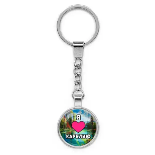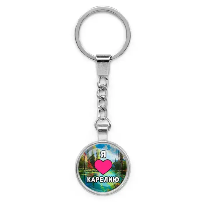 Брелок сувенирный круглой формы с изображением «Я люблю Карелию». Материал — бижутерный сплав со стеклянной линзой.