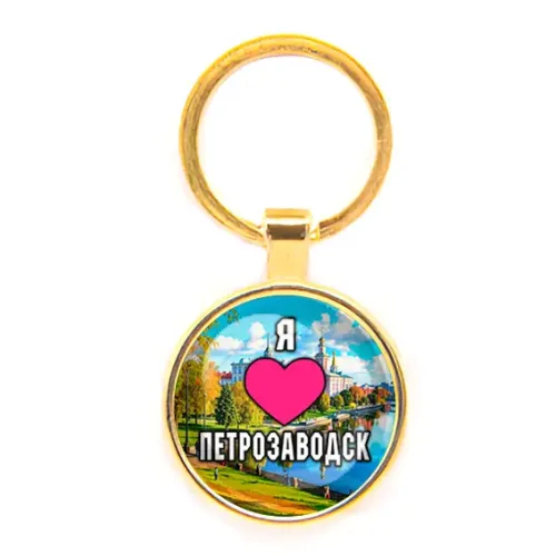 Круглый брелок-сувенир из бижутерного сплава с надписью «Я люблю Петрозаводск».