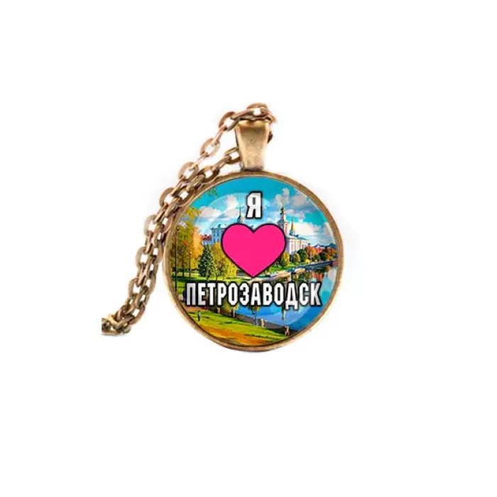 Сувенирный кулон с изображением «Я люблю Петрозаводск» из бижутерного сплава с бронзовым покрытием и стеклянной линзой.