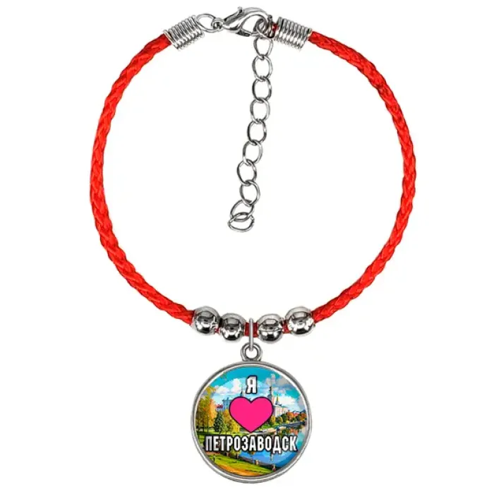 Браслет из красного шнура с металлической подвеской, на которой изображена надпись «Я люблю Петрозаводск».