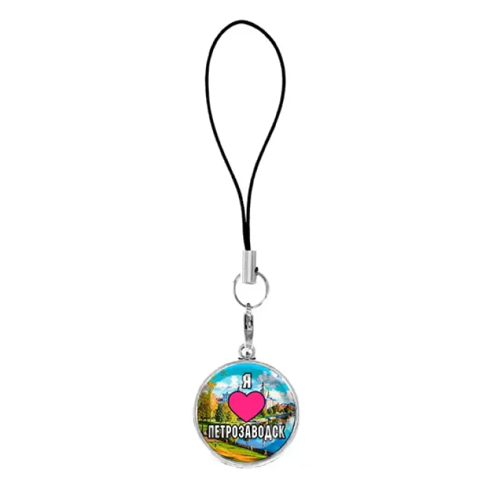 Подвеска для телефона из бижутерного сплава под серебро с изображением и надписью «Я люблю Петрозаводск».
