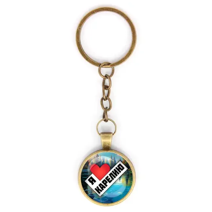 Круглый брелок-сувенир из бижутерного сплава с бронзовым покрытием и стеклянной линзой, с изображением «Я люблю Карелию».