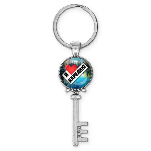 Брелок для ключей в виде ключа с надписью «Я люблю Карелию». Материал — бижутерный сплав с покрытием под серебро и стеклянной линзой.