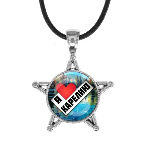 Кулон в форме звезды с изображением «Я люблю Карелию». Материал: бижутерный сплав под серебро и стекло.