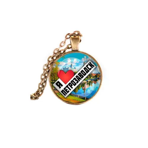 Сувенирный кулон с изображением Петрозаводска. Изготовлен из бижутерного сплава с бронзовым покрытием и защитной стеклянной линзой.