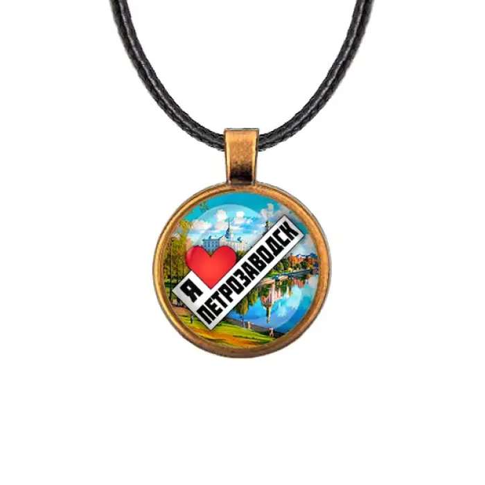 Сувенирный кулон с символикой Петрозаводска. Изготовлен из бижутерного сплава с бронзовым покрытием и стеклянной линзой.