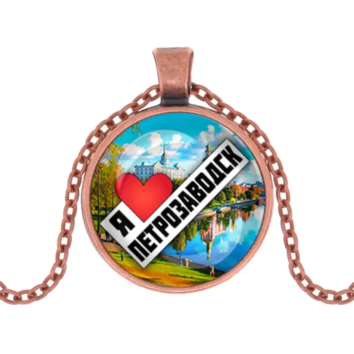 Сувенирный кулон с символикой города Петрозаводск, выполненный из бижутерного сплава с медным покрытием и стеклянной линзой.