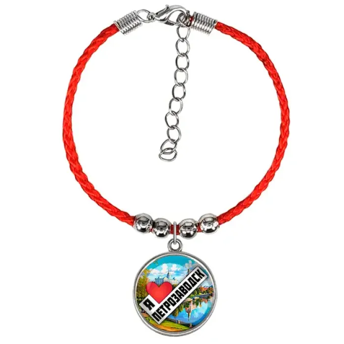 Браслет из красного шнура с металлической основой и выпуклым стеклом, сувенирный аксессуар с символикой Петрозаводска.