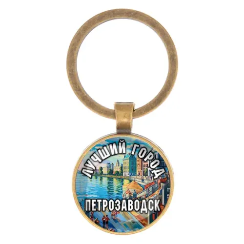 Круглый брелок-сувенир из бижутерного сплава с покрытием под бронзу и стеклянной линзой, с изображением города Петрозаводска.
