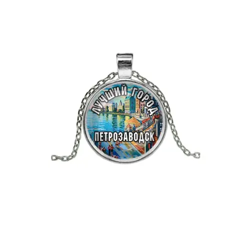 Кулон с цепочкой, посвящённый Петрозаводску. Изготовлен из бижутерного сплава с серебристым покрытием и стеклянной линзой.