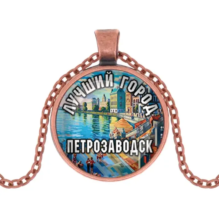Сувенирный кулон с изображением Петрозаводска. Изготовлен из бижутерного сплава с медным покрытием и стеклянной линзой.