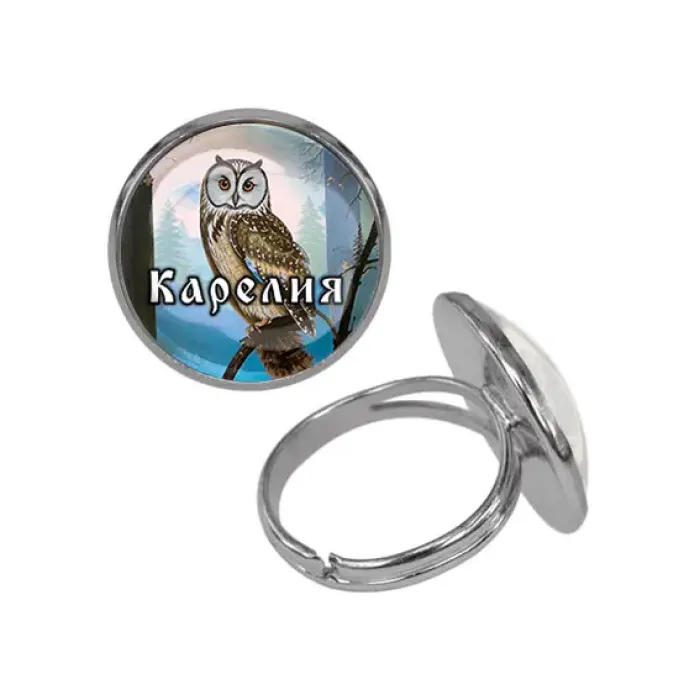 Безразмерное кольцо из бижутерного сплава с изображением под выпуклой стеклянной линзой.