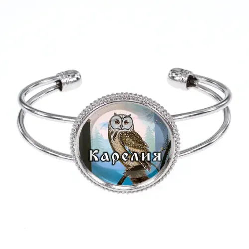 Металлический браслет в цвете серебра с декоративным элементом под стеклянной линзой.