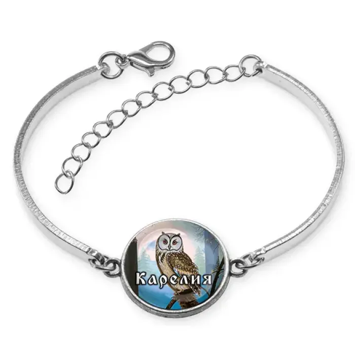 Металлический браслет в цвете серебра с декоративным элементом под стеклянной линзой.