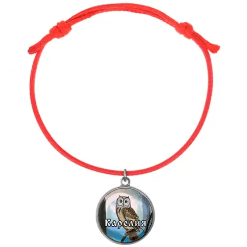 Браслет из красного шнура с металлической подвеской. Подвеска имеет полиграфическую вставку под выпуклым стеклом.