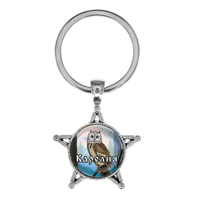 Брелок для ключей в виде звезды из бижутерного сплава под серебро со стеклянной линзой.