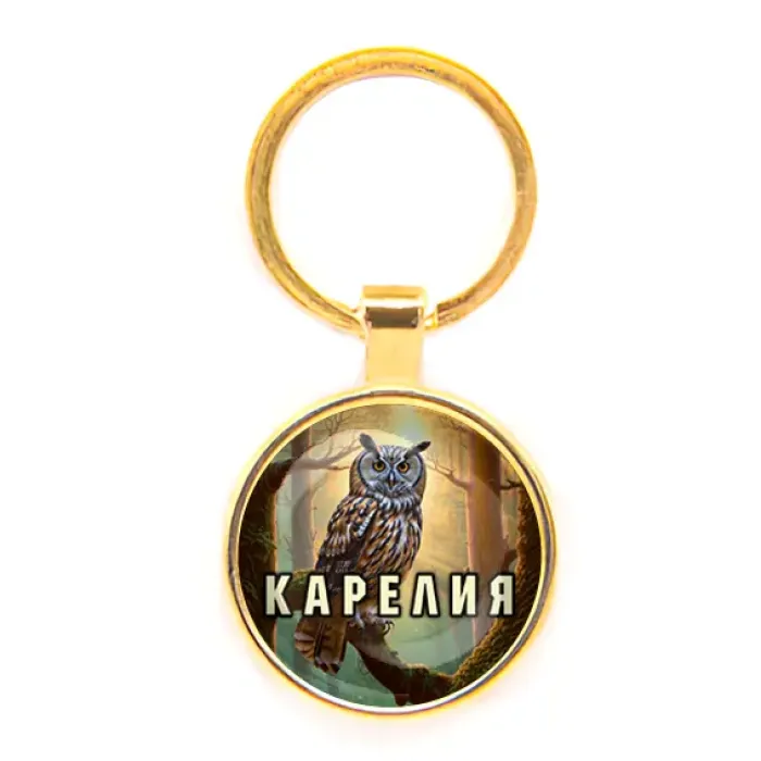Круглый брелок из бижутерного сплава с золотым покрытием и стеклянной линзой, тематика — Карелия.