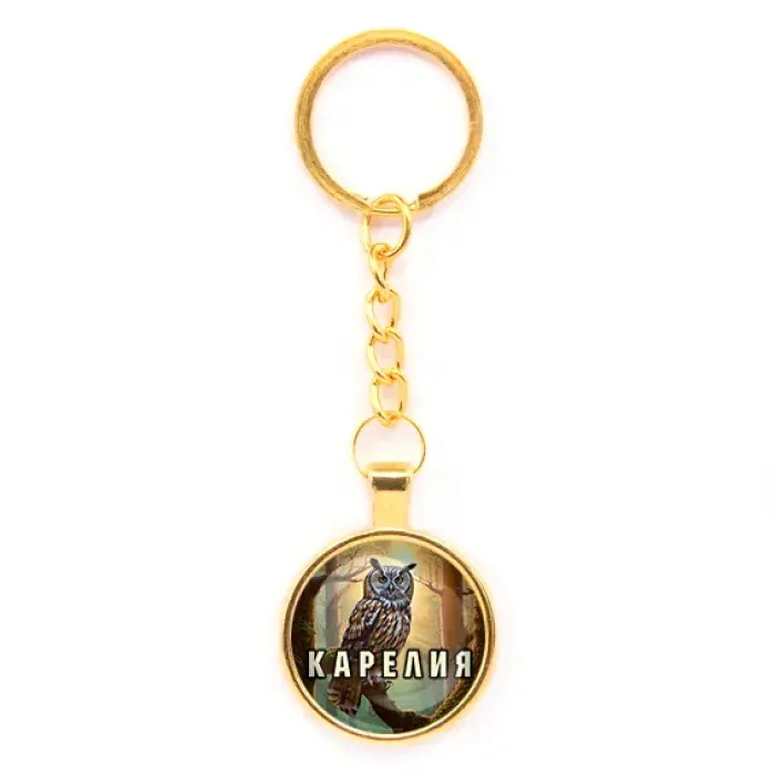 Брелок для ключей круглой формы в золотом цвете с изображением Карелии.