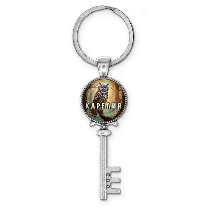 Брелок для ключей в форме ключа из бижутерного сплава с изображением, защищённым стеклянной линзой.