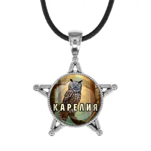 Кулон из бижутерного сплава под серебро со стеклянной линзой и изображением на тему Карелии.